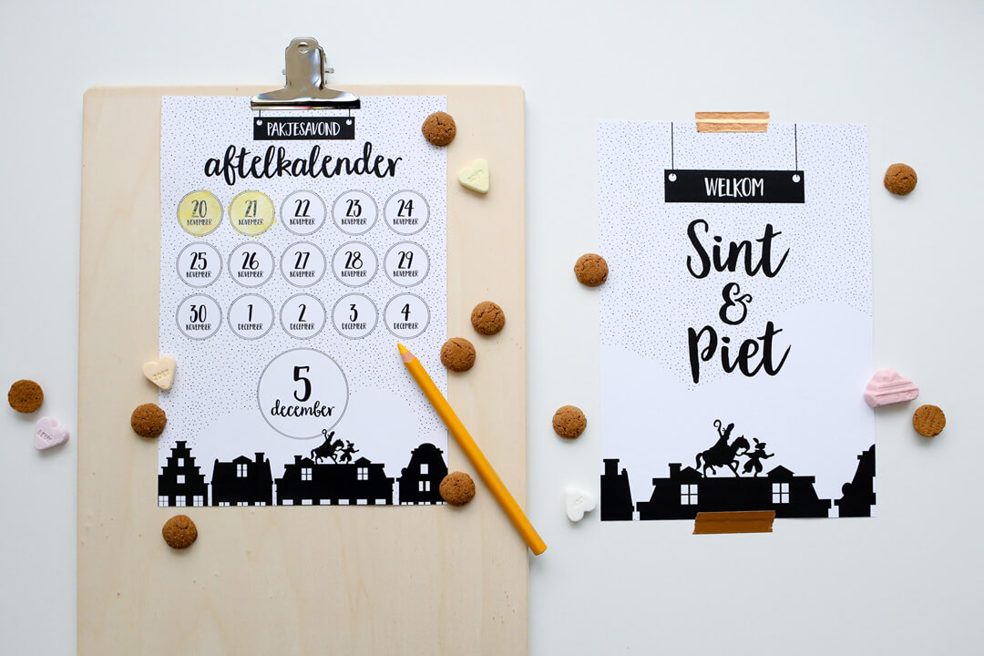 Wat heerlijk, de Sint en zijn Pieten zijn weer in ons land. Worden jullie er ook altijd zo blij van? Wij wel! Al die enthousiaste kinderen, vrolijke sinterklaasliedjes, schoentje zetten, en natuurlijk heel veel pepernoten en chocolade. Maar waar wij altijd extra blij van worden is dat we ons huis weer kunnen versieren met de mooiste Sinterklaas decoratie. Daarom hebben we een mooie zwart-wit poster gemaakt, waarmee je Sint en Piet kunt verwelkomen. En omdat de meeste kinderen (en ook volwassenen) niet kunnen wachten tot het Pakjesavond is hebben we ook een leuke aftelkalender gemaakt. Daarmee streep je de dagen af tot 5 december, en wordt het wachten nét iets leuker.