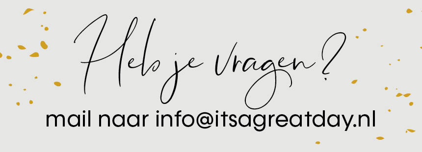"We zijn zo blij met IT'S A GREAT DAY! We hebben verschillende kaarten gecombineerd, zodat we een eigen stijl hebben op onze bruiloft. Van trouwkaart tot menukaart, van posters tot bedankkaart, alles ziet er prachtig uit :-)"