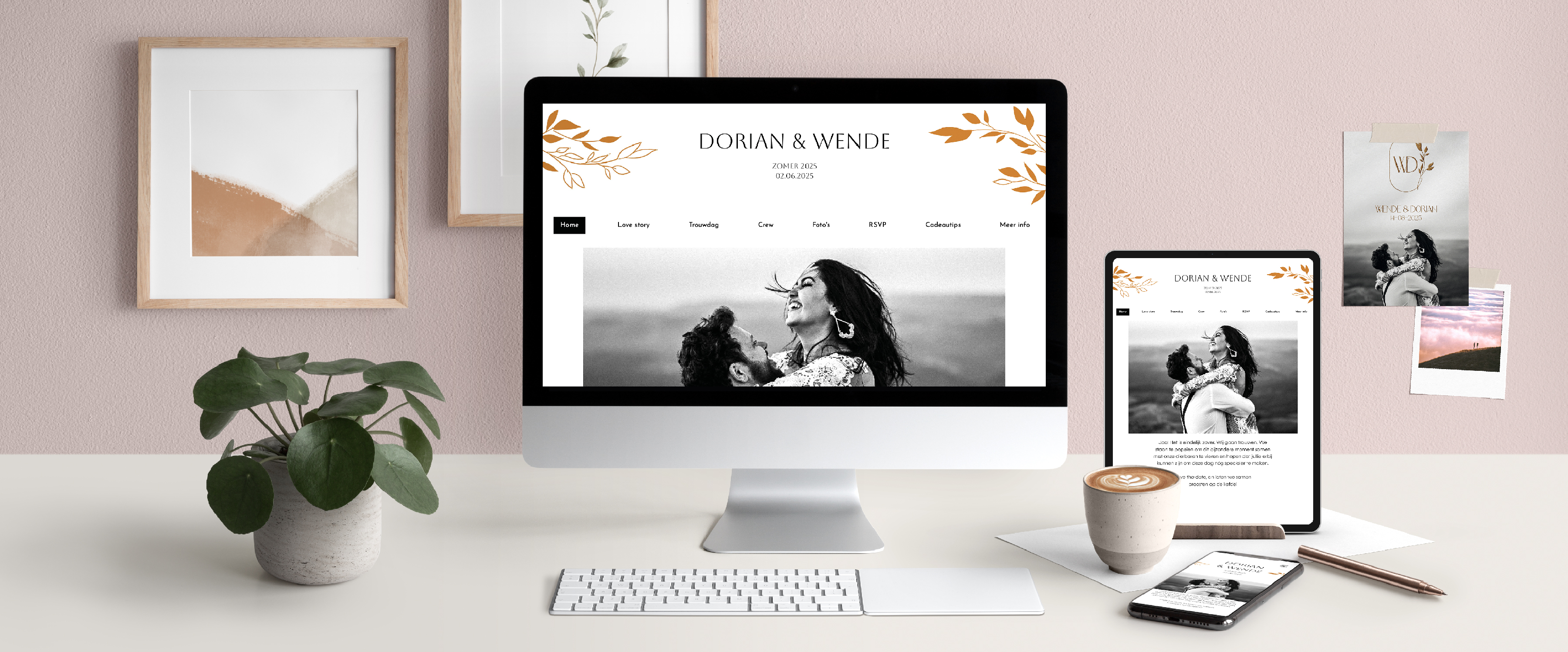 Eén plek waar alles over jullie bruiloft te vinden is? Dat kan! Met een eigen wedding website van THE GREAT DAY, helemaal in de stijl van jullie bruiloft. Kies uit één van onze stijlen of maak jullie eigen design. Alles is makkelijk zelf aan te passen. De website wordt écht persoonlijk met jullie lovestory, het programma van de trouwdag, cadeautips, én met jullie eigen foto’s. De gasten kunnen kennis maken met de crew, ze vinden antwoord op hun vragen, en ze kunnen jullie laten weten of ze er bij zijn via het RSVP formulier. Superhandig!