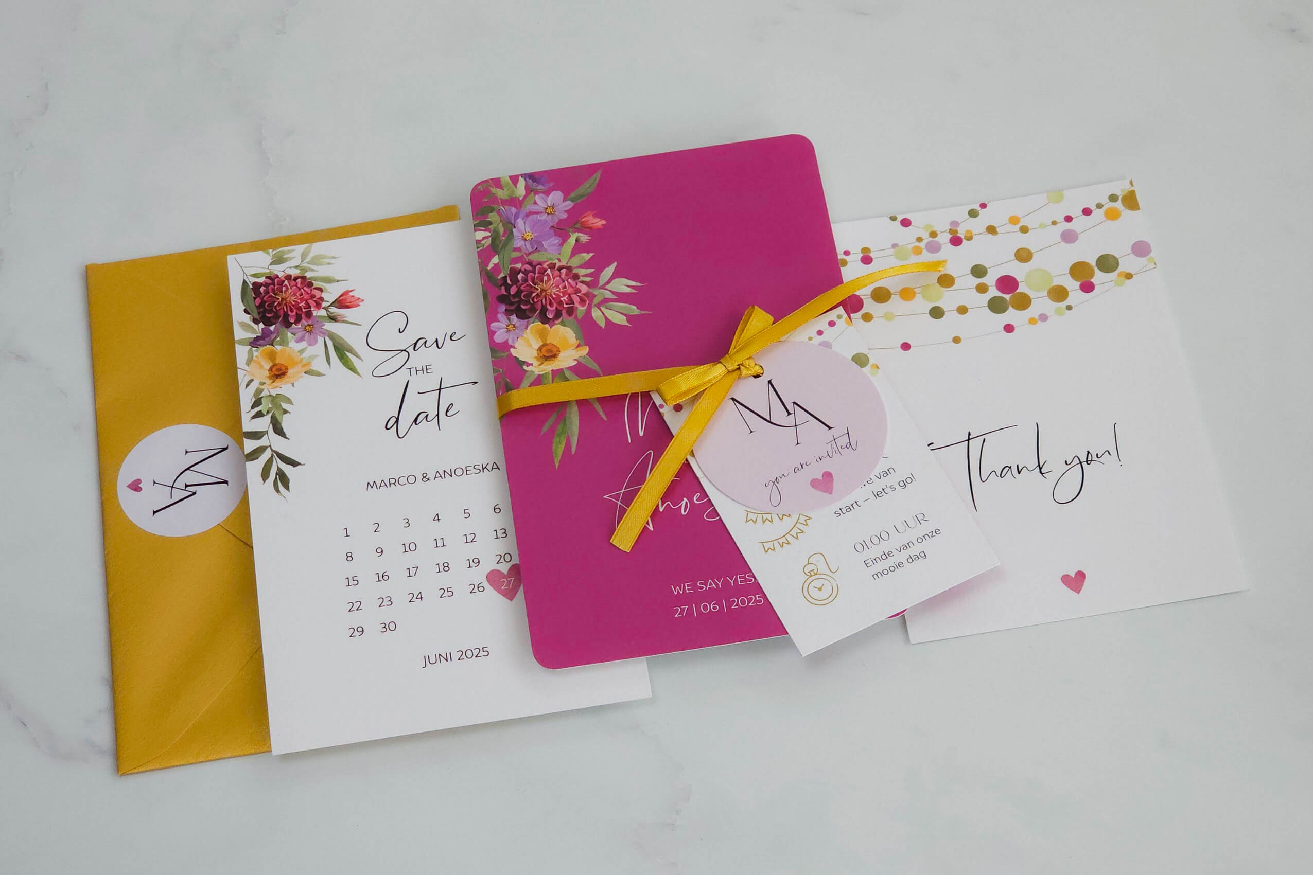 Zodra we alles van jullie hebben ontvangen, gaan we aan de slag. Meestal beginnen we met de save the date of de trouwkaart. Wanneer we de ontwerpen klaar hebben sturen we jullie een paar voorstellen via e-mail, waaruit jullie kunnen kiezen. Dan gaan we het ontwerp finetunen, zodat het uiteindelijk helemaal naar wens is. We voeren het ontwerp vervolgens kosteloos door in eventuele andere producten, zoals menukaarten, naamkaartjes, stickers, etiketten, trouwbeloftes, kinderakte, het welkomstbord, gastenboek en nog veel meer. Vanzelfsprekend betalen jullie dan wel voor de drukkosten daarvan.