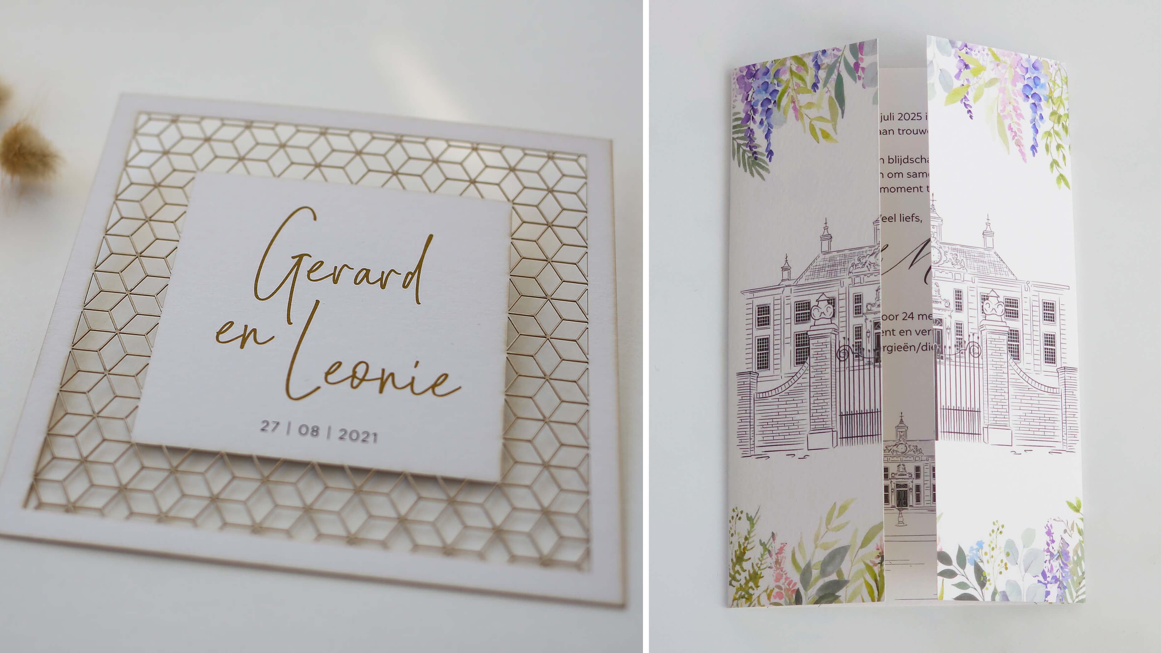 In onze collectie vind je bijzondere trouwkaarten in verschillende stijlen. Van festival tot destination wedding, en van vintage tot Disney Inspired. Maar misschien vinden jullie toch niet precies de stijl die bij jullie past. Dat is geen probleem, want dan maken wij graag een ontwerp op maat voor jullie! Met meer dan 30 jaar ervaring als grafisch vormgevers kunnen wij in elke stijl ontwerpen en illusteren, zodat jullie een extra bijzonder ontwerp krijgen, dat perfect is afgestemd op jullie én op de trouwdag!